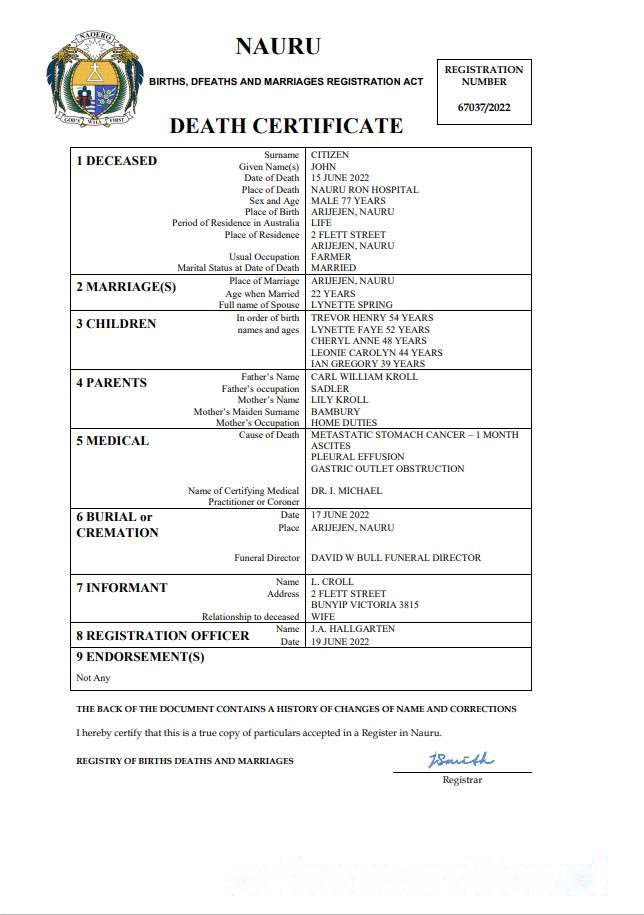 Nauru death certificate Word and PDF template download template file
