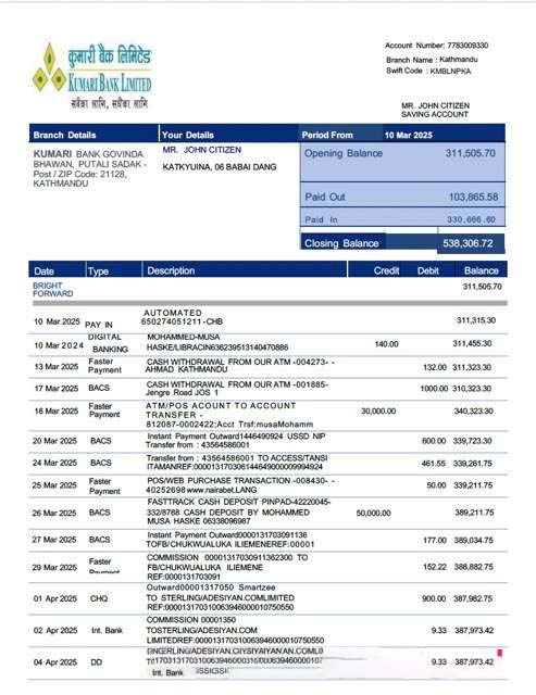 Nepal Kumari Bank Limited account statement Word and PDF template download template file