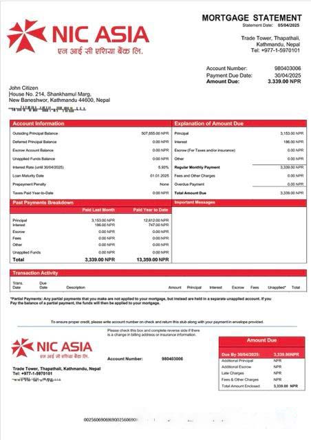 Nepal NIC Asia Bank mortgage statement Word and PDF template download template file