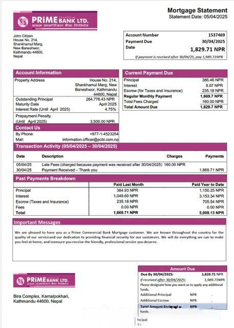 Nepal Prime Commercial Bank mortgage statement Word and PDF template download template file