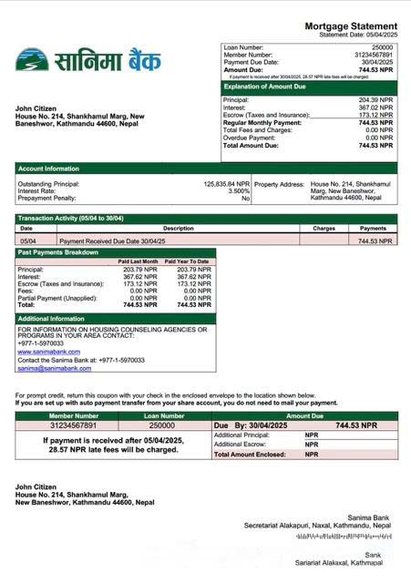 Nepal Sanima Bank mortgage statement Word and PDF template download template file