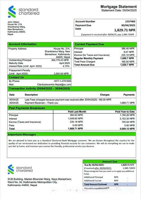 Nepal Standard Chartered Bank mortgage statement Word and PDF template download template file