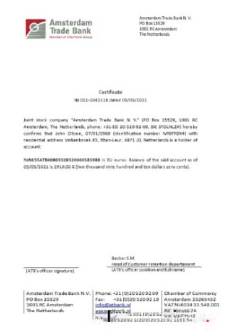 Netherlands Amsterdam Trade Bank certificate download template file