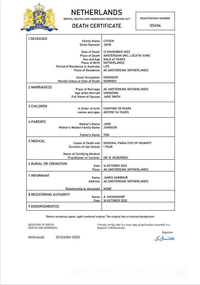 Netherlands vital record death certificate Word and PDF template download template file