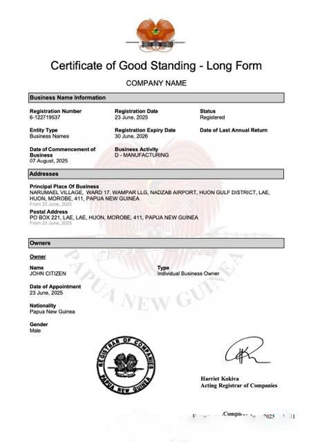 New Guinea certificate of good standing Word and PDF template, version 2 download template file