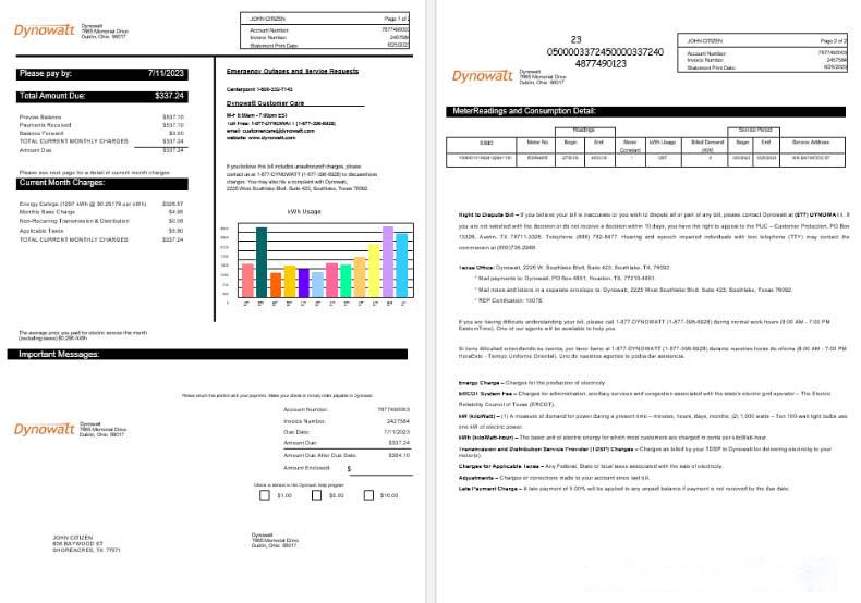New York Dynowatt electricity utility bill Word and PDF formats download template file