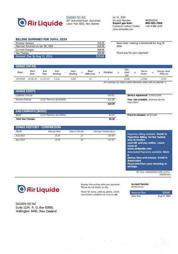 New Zealand Air Liquide gas business utility bill template in Word and PDF formats download template file