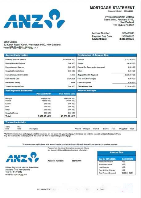 New Zealand ANZ Bank mortgage statement Word and PDF template download template file