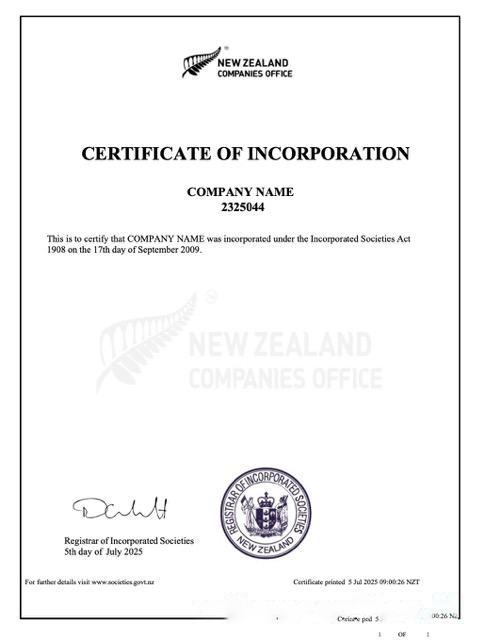 New Zealand certificate of incorporation Word and PDF template download template file