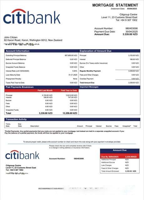 New Zealand Citibank New Zealand mortgage statement Word and PDF template download template file