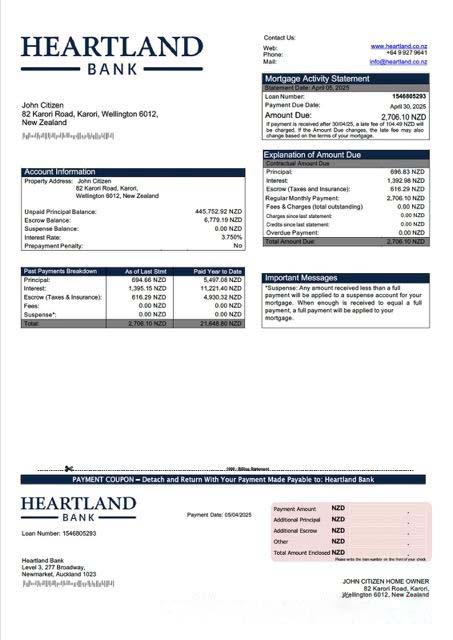 New Zealand Heartland Bank mortgage statement Word and PDF template download template file