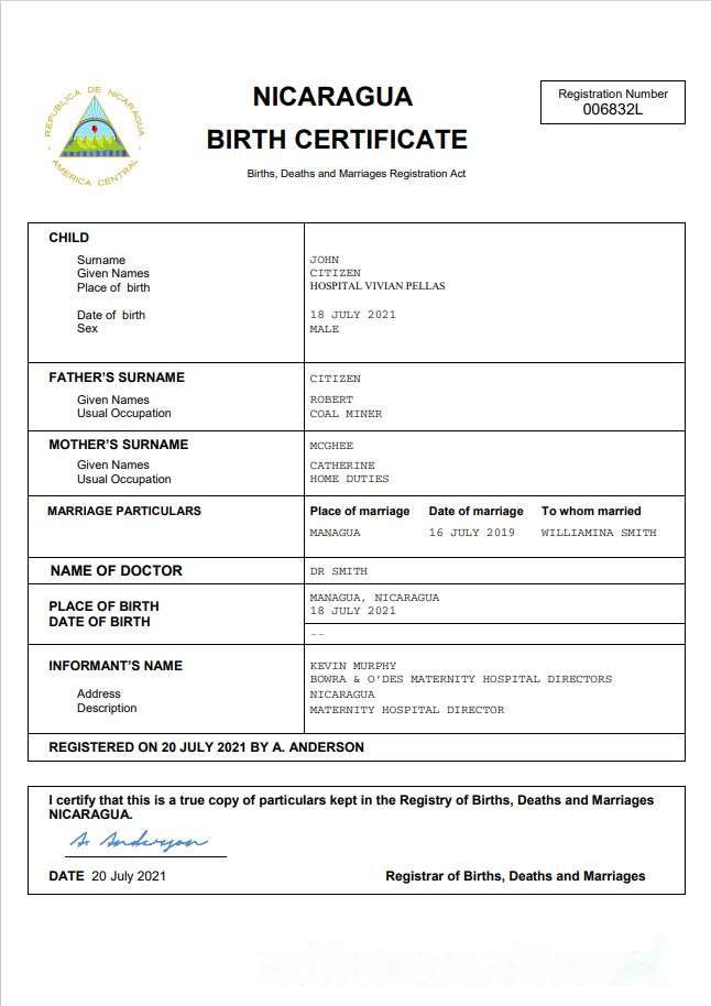 Nicaragua vital record birth certificate Word and PDF template download template file
