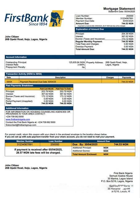 Nigeria First Bank Nigeria mortgage statement Word and PDF template download template file