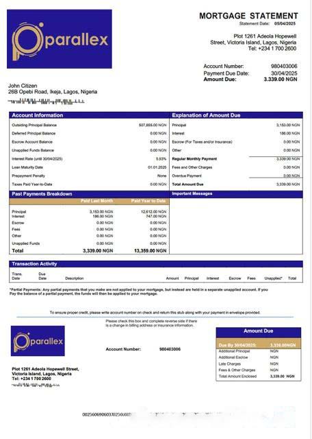 Nigeria Parallex Bank mortgage statement Word and PDF template download template file