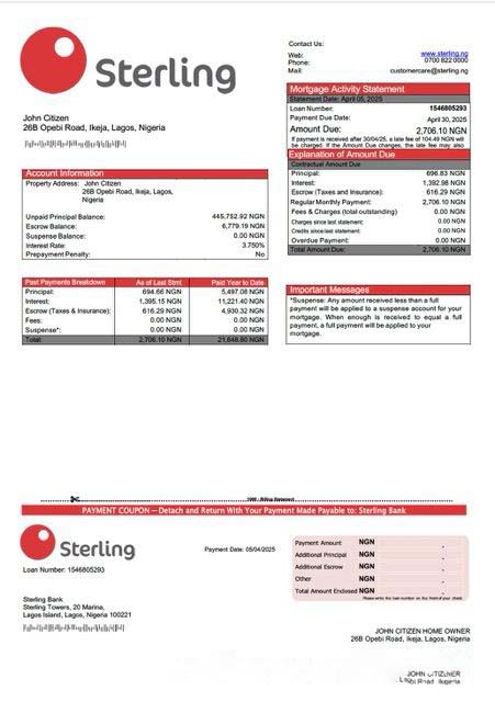 Nigeria Sterling Bank mortgage statement Word and PDF template download template file