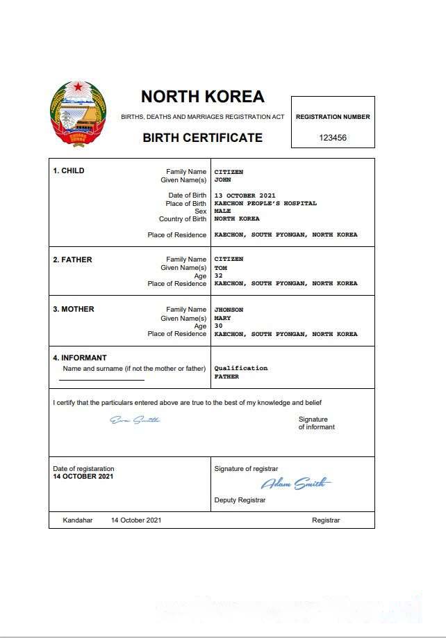 Be the first to review “North Korea birth certificate Word and PDF template download template file”