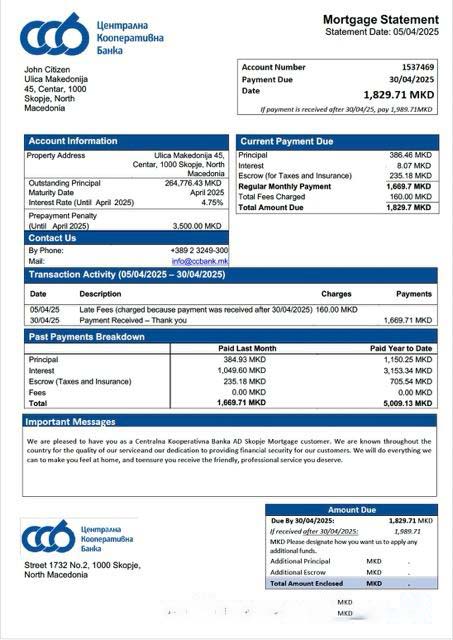 North Macedonia Centralna Kooperativna Banka AD Skopje mortgage statement Word and PDF template download template file