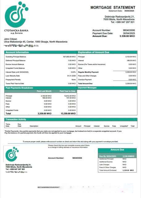 North Macedonia Stopanska Banka AD Bitola mortgage statement Word and PDF template download template file
