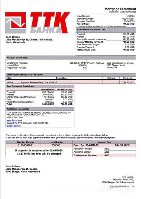 North Macedonia TTK Banka mortgage statement Word and PDF template download template file
