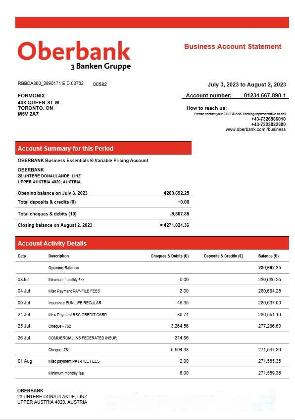 Oberbank company checking account statement Word and PDF template download template file