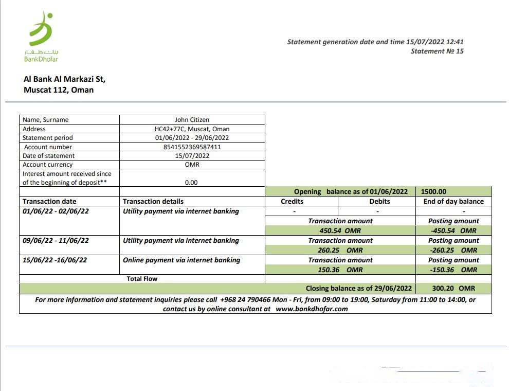Oman Bank Dhofar bank statement template in Word and PDF format download template file