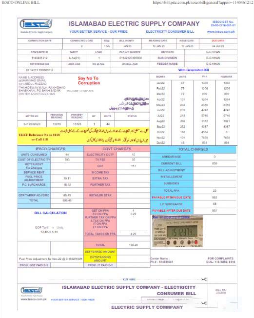 PAKISTAN IESC utility bill Word and PDF template download template file