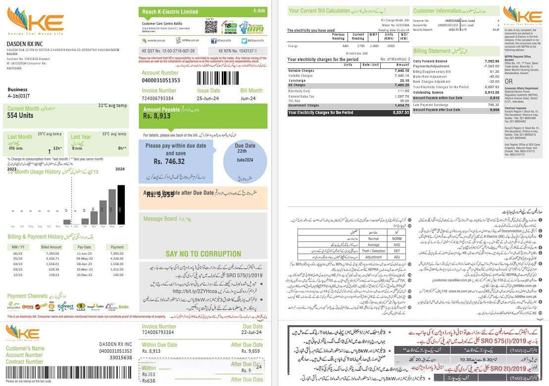 Pakistan KE Electricity business utility bill template in Word and PDF formats, 2 pages download template file