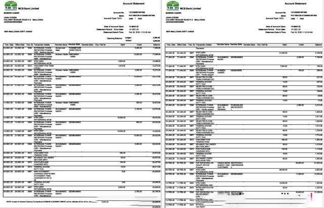 Pakistan MCB Bank account statement Word and PDF template, 2 pages download template file