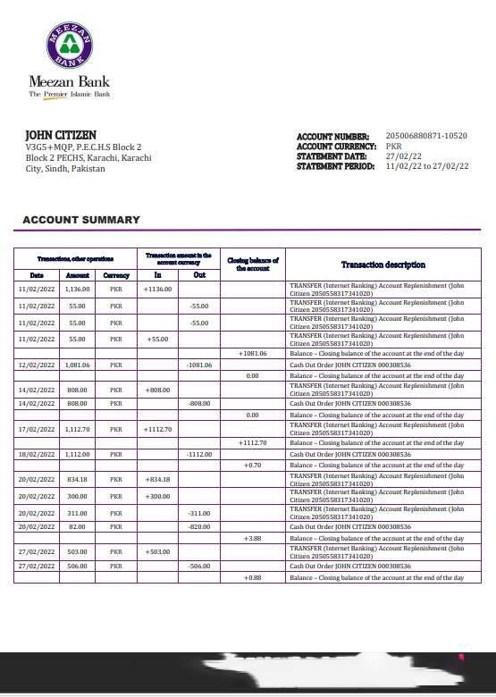 Pakistan Meezan bank statement template in Word and PDF format download template file