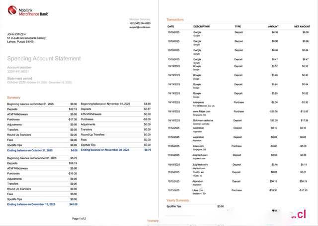 Pakistan Mobilink Microfinance Bank statement of account Word and PDF template, 2 pages, version 2 download template file