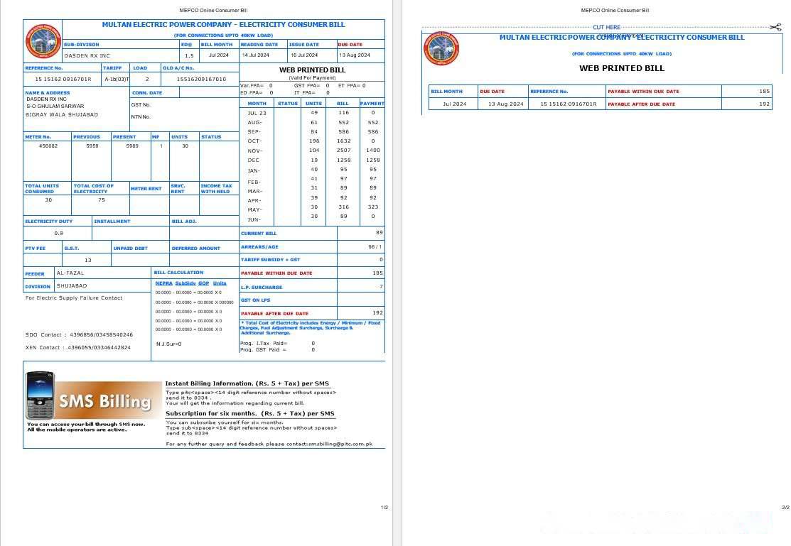 PAKISTAN MULTAN ELECTRIC POWER business utility bill Word and PDF template download template file