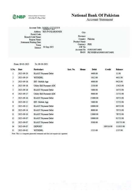 Pakistan National Bank of Pakistan account statement Word and PDF template download template file