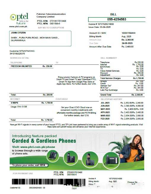 Pakistan PTCL utility bill template in Word and PDF formats download template file
