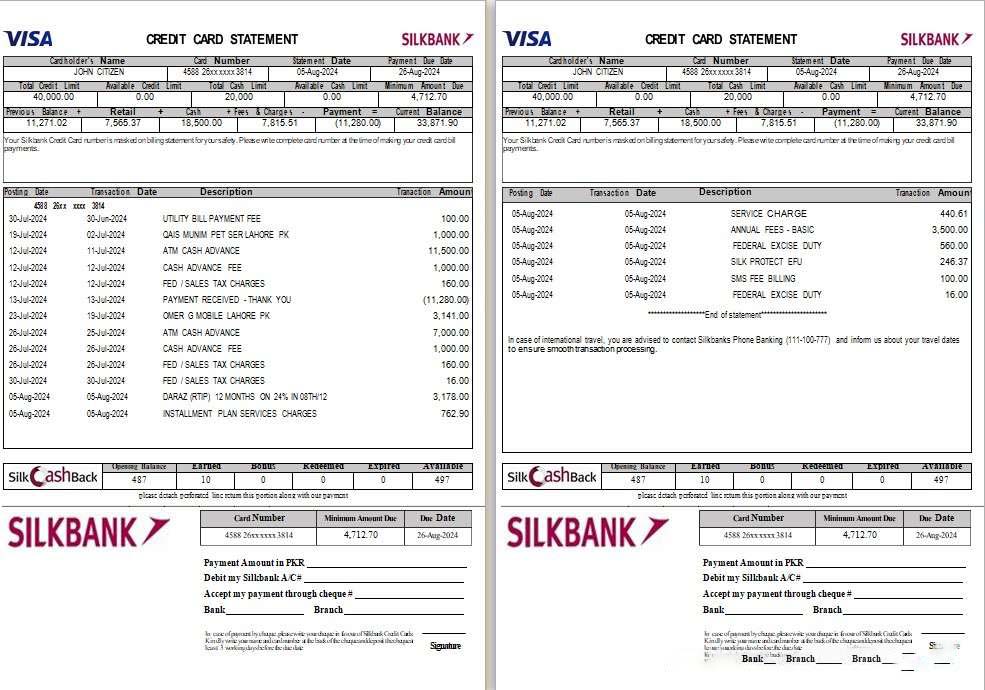 Pakistan Silkbank statement Word and PDF template, 2 pages download template file