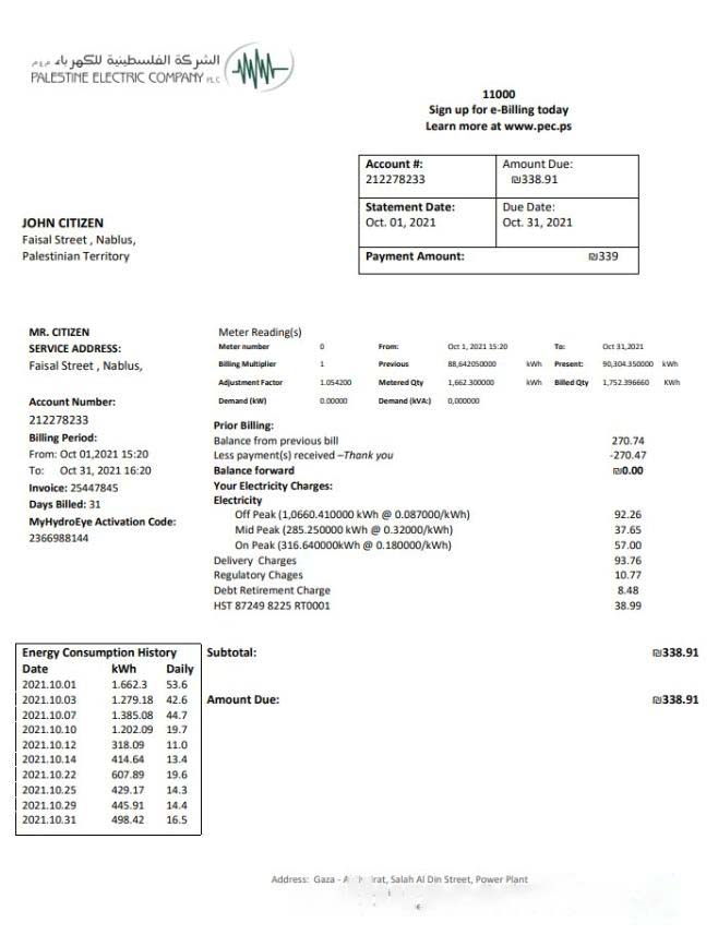 Palestine Electric Company (PEC) utility bill template in Word and PDF format download template file