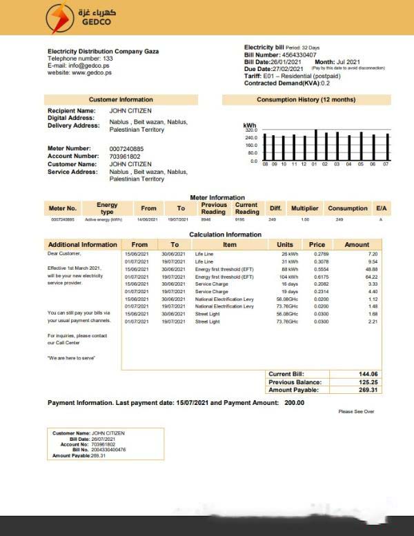 Palestine Electricity Distribution Company Gaza (GEDCO) utility bill template in Word and PDF format download template file