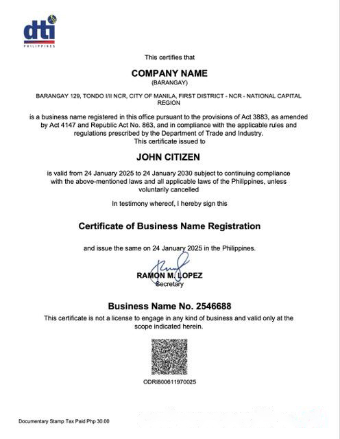 Philippines Barangay certificate of business name registration Word and PDF template download template file