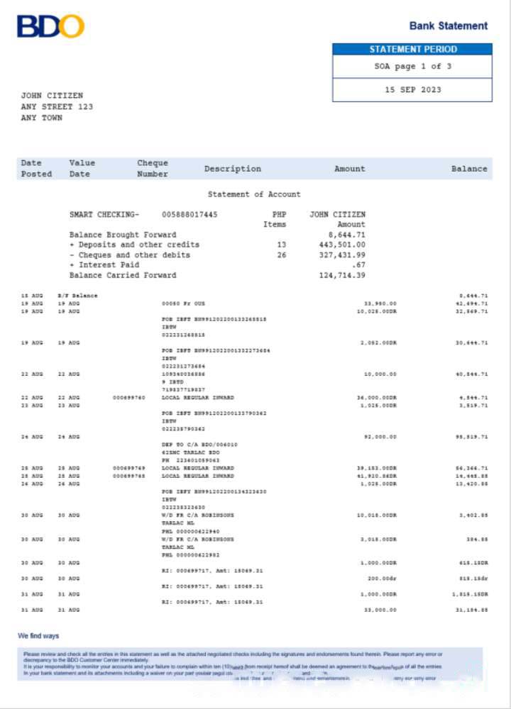 Philippines BDO bank statement Word and PDF, version 2 download template file