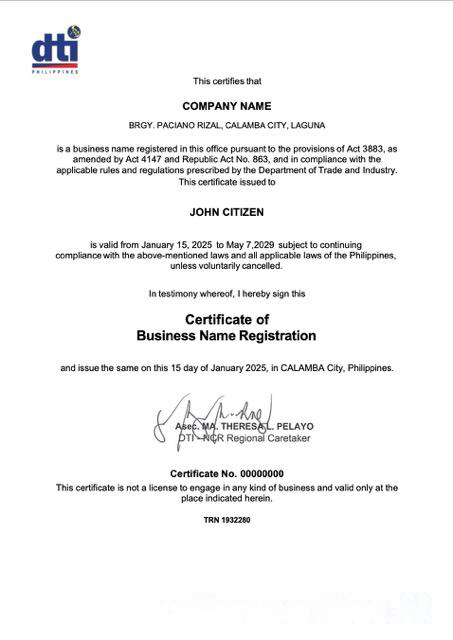 Philippines Calamba certificate of business name registration Word and PDF template download template file