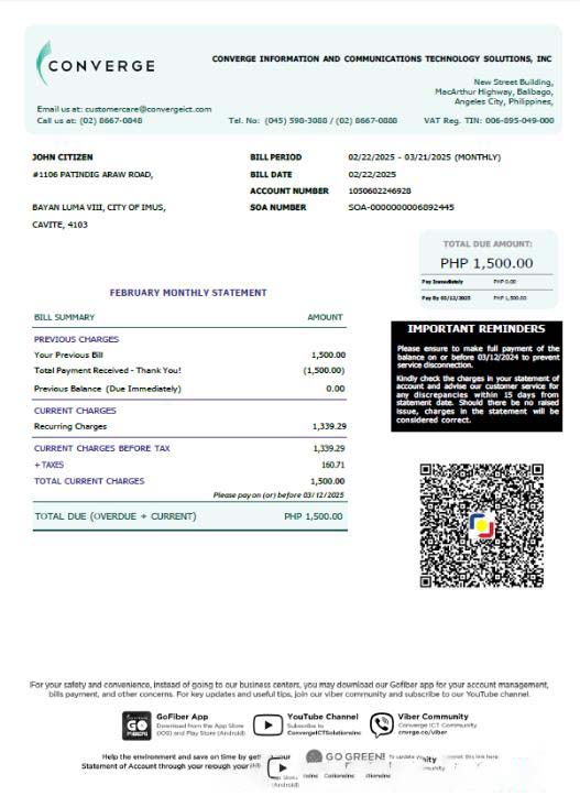 Philippines Converge utility bill template in Word and PDF formats download template file