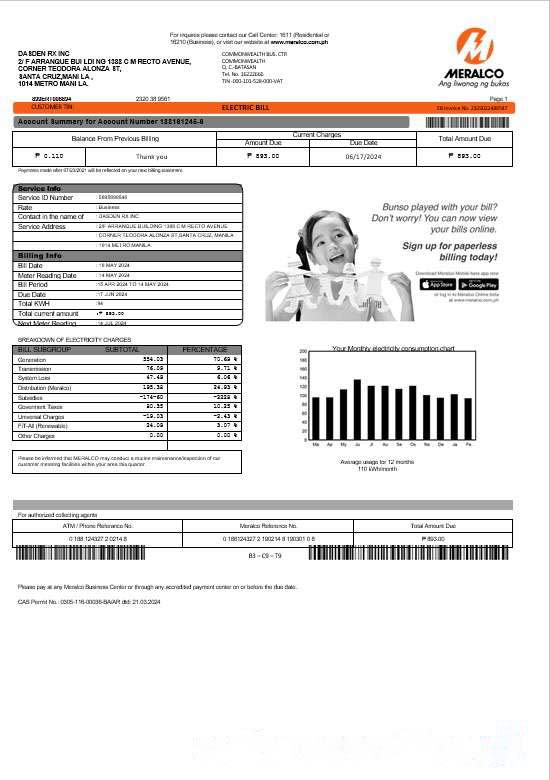 Philippines Meralco electricity business utility bill template in Word and PDF formats download template file