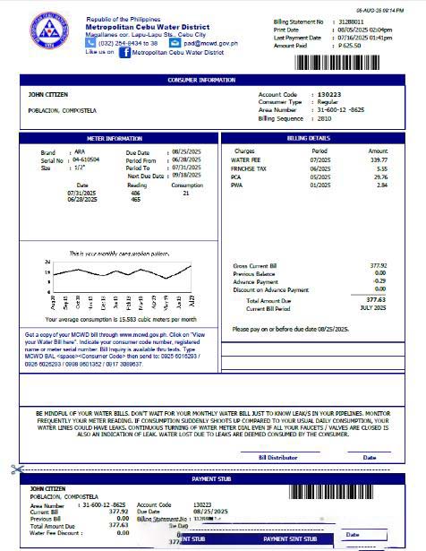 Philippines Metropolitan Cebu Water District utility bill template in Word and PDF formats download template file