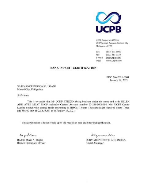Philippines UCPB bank deposit certification letter download template file