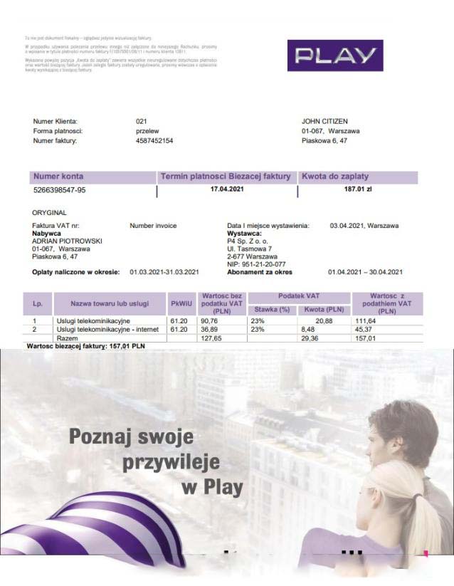 Poland Play utility bill template in Word and PDF format, fully editable download template file