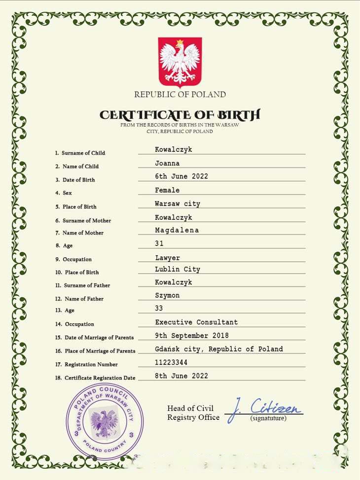 Poland vital record birth certificate PSD template, download template file