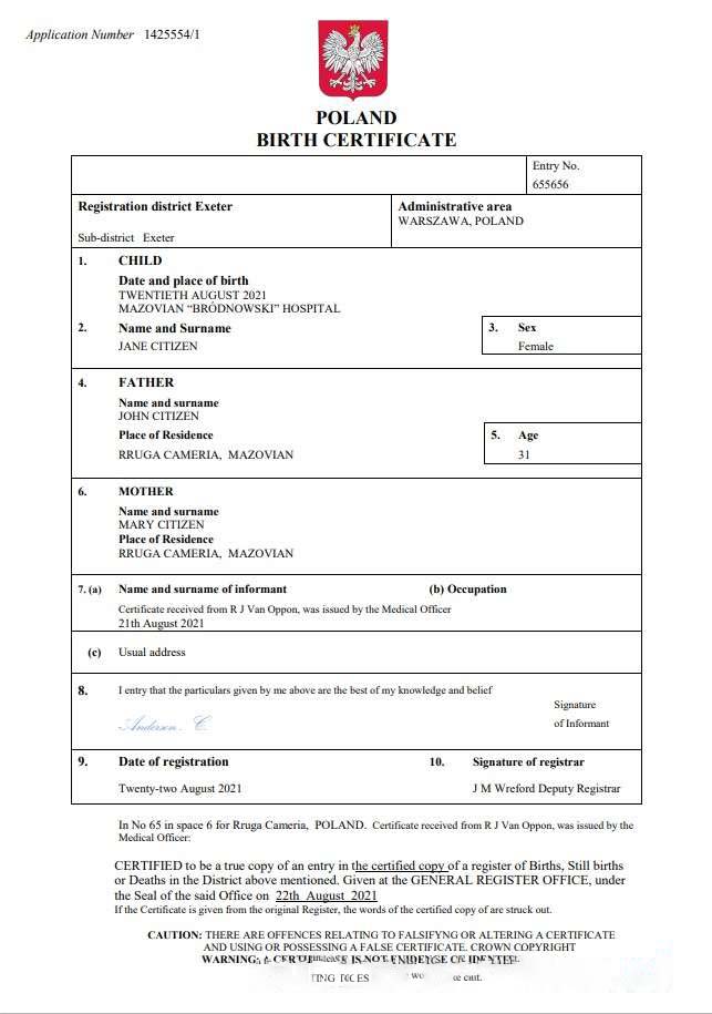 Poland vital record birth certificate Word and PDF template download template file