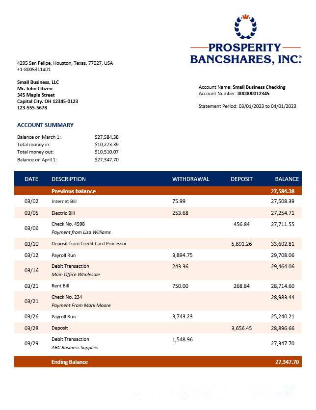 Prosperity Bancshares Inc company checking account statement Word and PDF template download template file