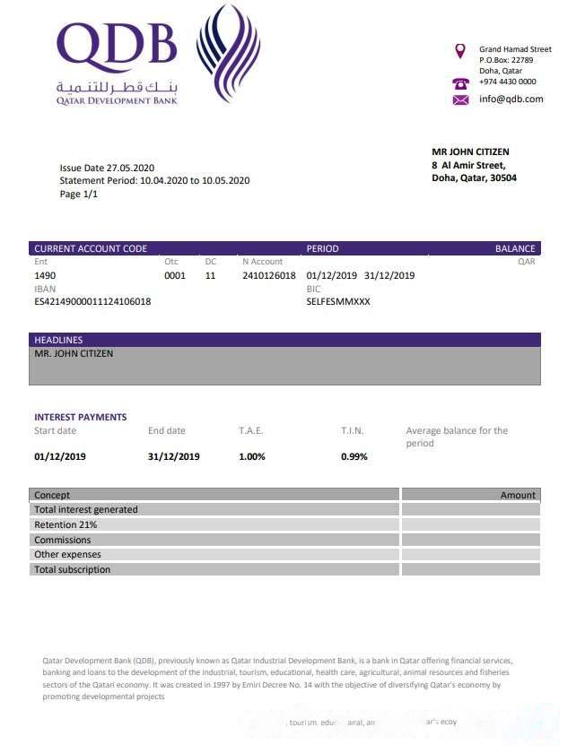 Qatar Development Bank statement template, Word and PDF format (.doc and .pdf) download template file