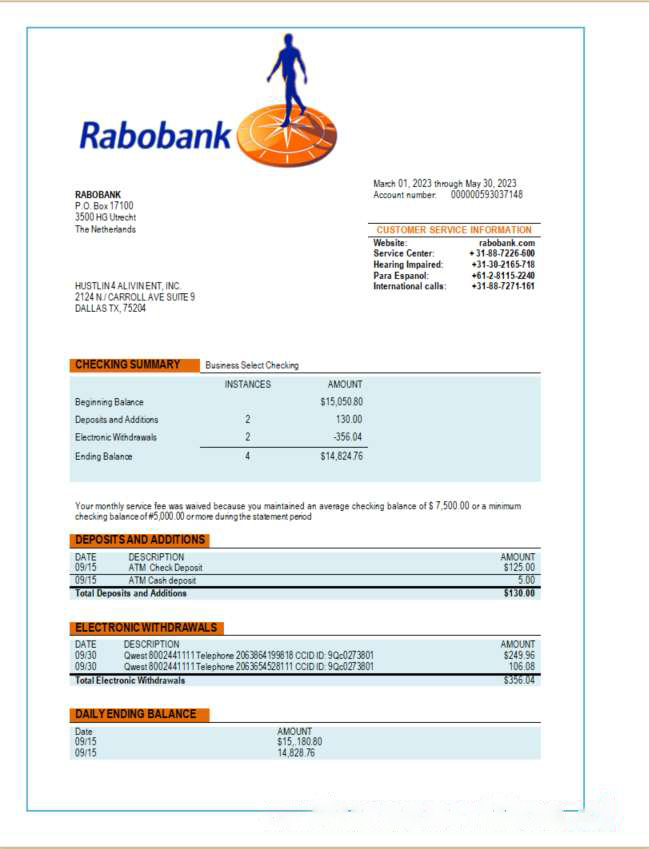 Rabobank bank organization account statement Word and PDF template download template file