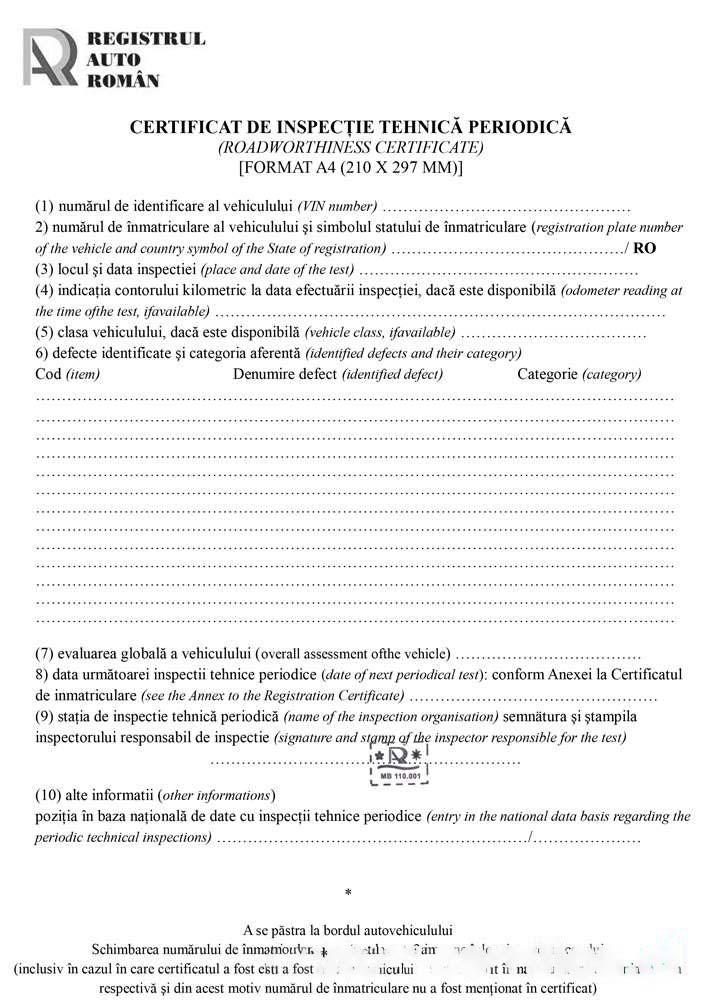 Romania Registrul Auto Roman Periodic technical inspection certificate (roadworthiness certificate) download template file